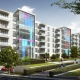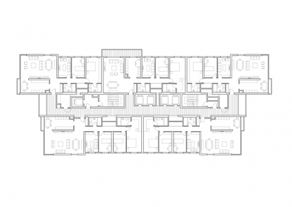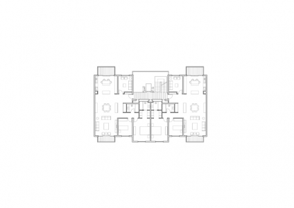 Multi-story blocks mark the higher topographic elevations, at the entrance, where the 40-storey-high block is the hallmark of the entire campus. Half of the building stock is allocated to lower -horizontal- blocks and the remaining half to higher ones, where, in the latter, the main core is arranged in a way to allow access to more apartments -that are uniquely designed on each floor. Horizontal block extend over seven stories, including the ground floor. The design of these units allocates two apartments on each floor, variations of the plan giving rise to the uniqueness of each apartment. The dining room is the epicenter of the living area inside the apartments and it is located right at the core of the apartment space, leading both to the kitchen and to the rest of the house. These apartments are given two terraces, one on each side.