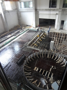 The largest water turbine test center in the world, TOBB UET HYDRO, is planned for a 600 square meter area on the basement floor. The space is 12 meters high and it receives day light form the indoor garden and the façade, although it is located on the basement floor. The 7 meter deep reinforced concrete box that is separated from the building with dilatation and covered with prefabricated planks contains the underfloor section of the mechanism and the water tank for the test center.
